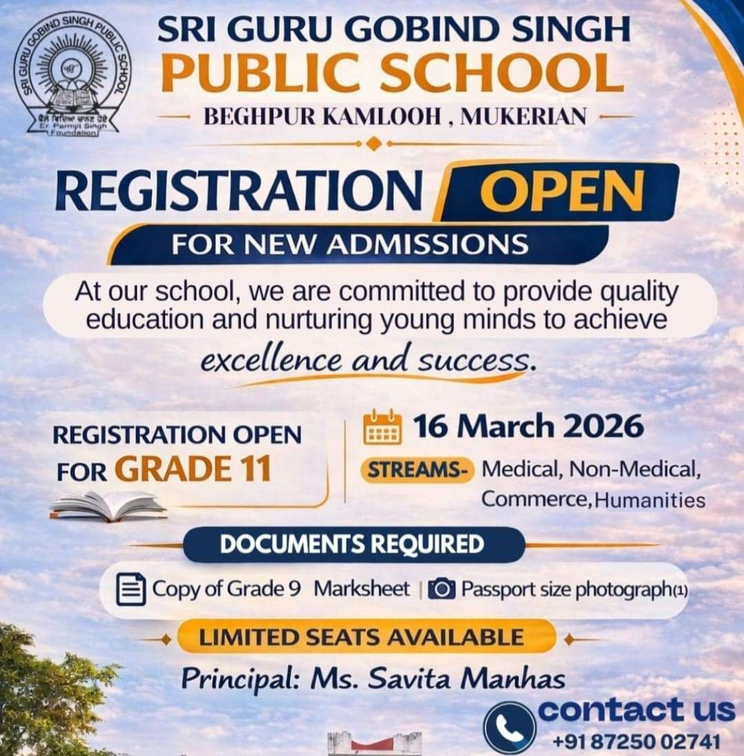 Sri Guru Gobind Singh Public School (SGGSPS, Mukerian) warmly invites applications for admission for the academic year 2026ā2027. Our institution is committed to providing a nurturing and inspiring learning environment that empowers students with knowledge, discipline, and strong moral values.